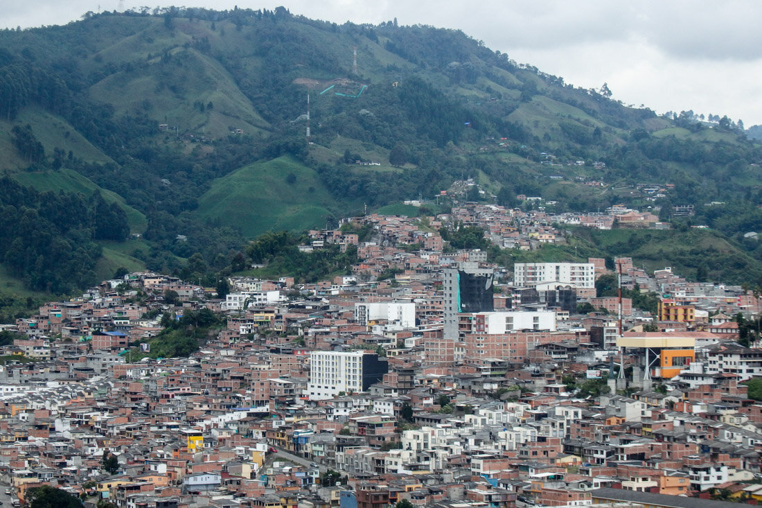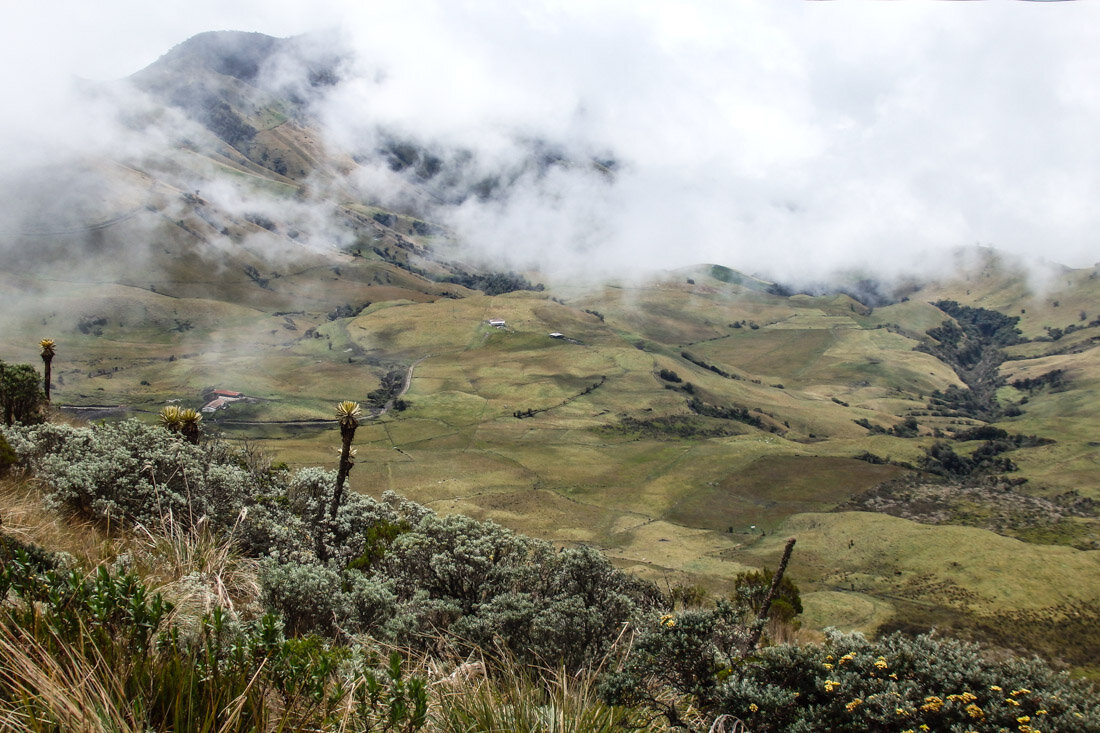После двух ночевок на высоте 4100, когда целый день лил дождь и мы не могли никуда выехать, утром наконец распогодилось и мы поехали наконец в Manizales. Для этого сначала еще немного поднялись по дороге и по пути заехали в centre de visitantes — северный вход в парк Brisas