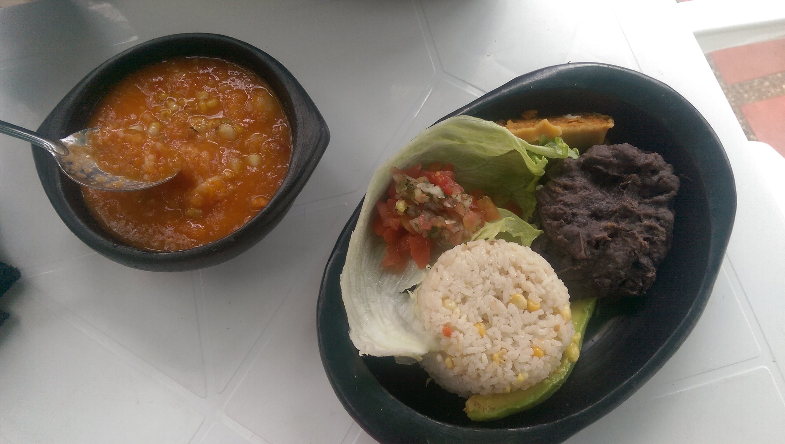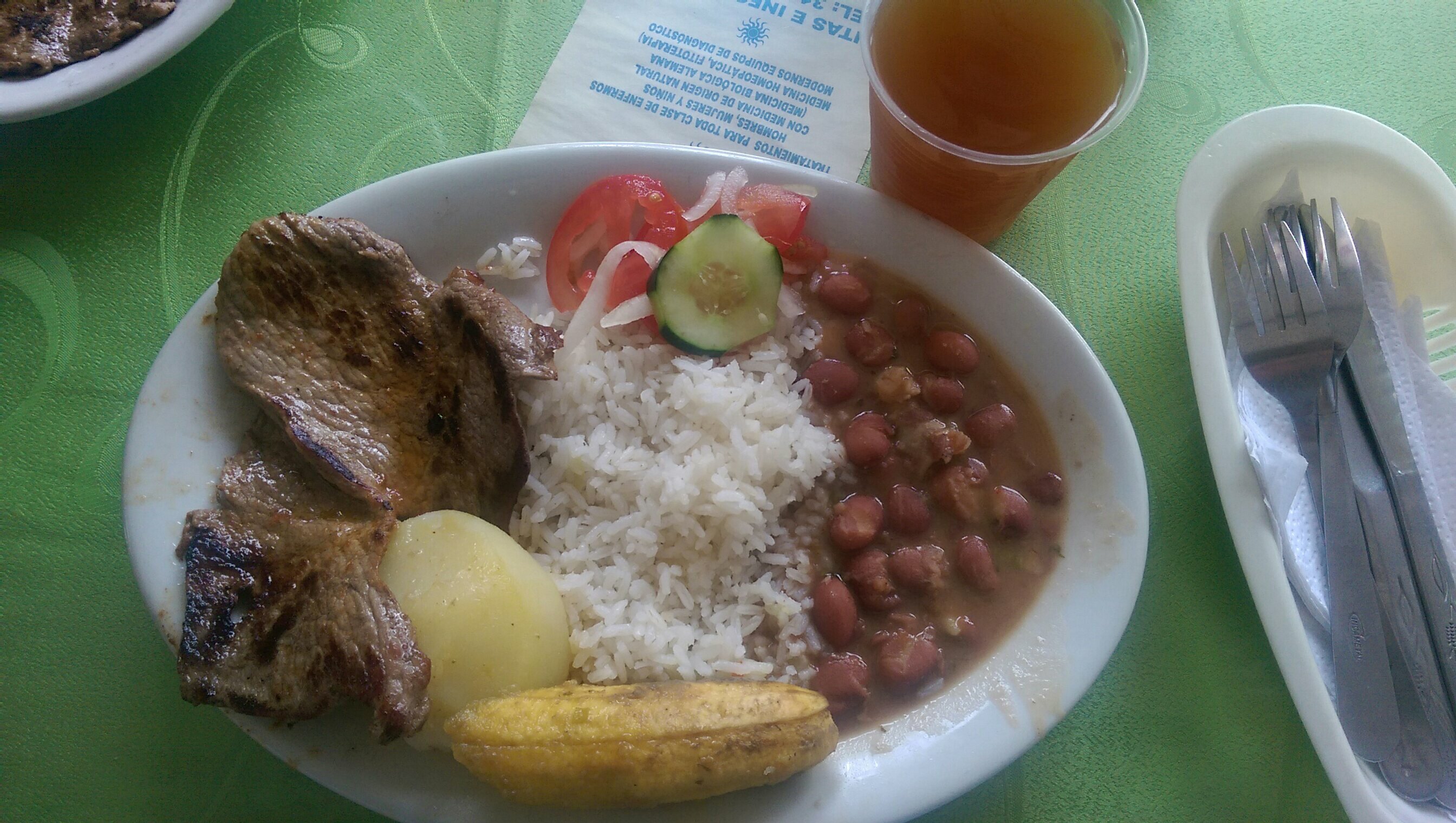 Desayuno-Almuerzo-comida .это, собственно, основная еда. Завтрак-обед-ужин. Мы только обедаем. Это значит, что в определенное время в кафе подается одно блюдо с некоторыми разновидностями. Обычное almuerzo это : тарелка супа (может быть несколько видов, но все присыпаны кинзой) и bandeja -тарелка со вторым. Оно включает в себя — кусок мяса (может быть разное и разного приготовления), рис, бобовая подливка, жаренный банан, картошка или батат и салатик. Плюс напиток-тоже может быть разный на выбор, в зависимости от статуса ресторана. Сколько мы не обедали, все время все разное, и как мясо приготовлено, и размеры порций, и цена. Обычно такой обед стоит 2-3 доллара