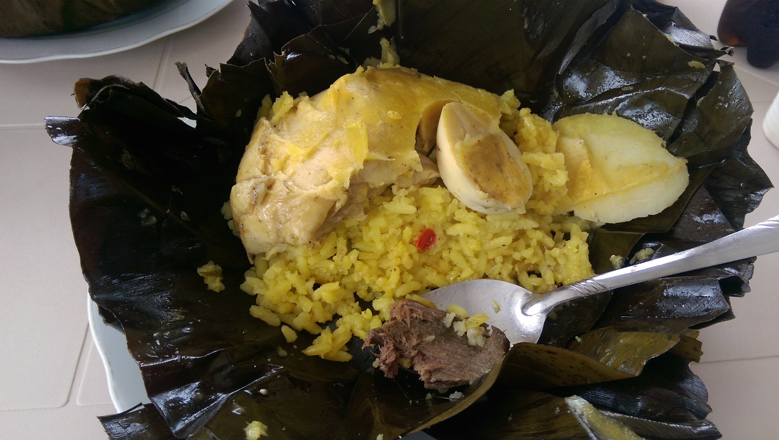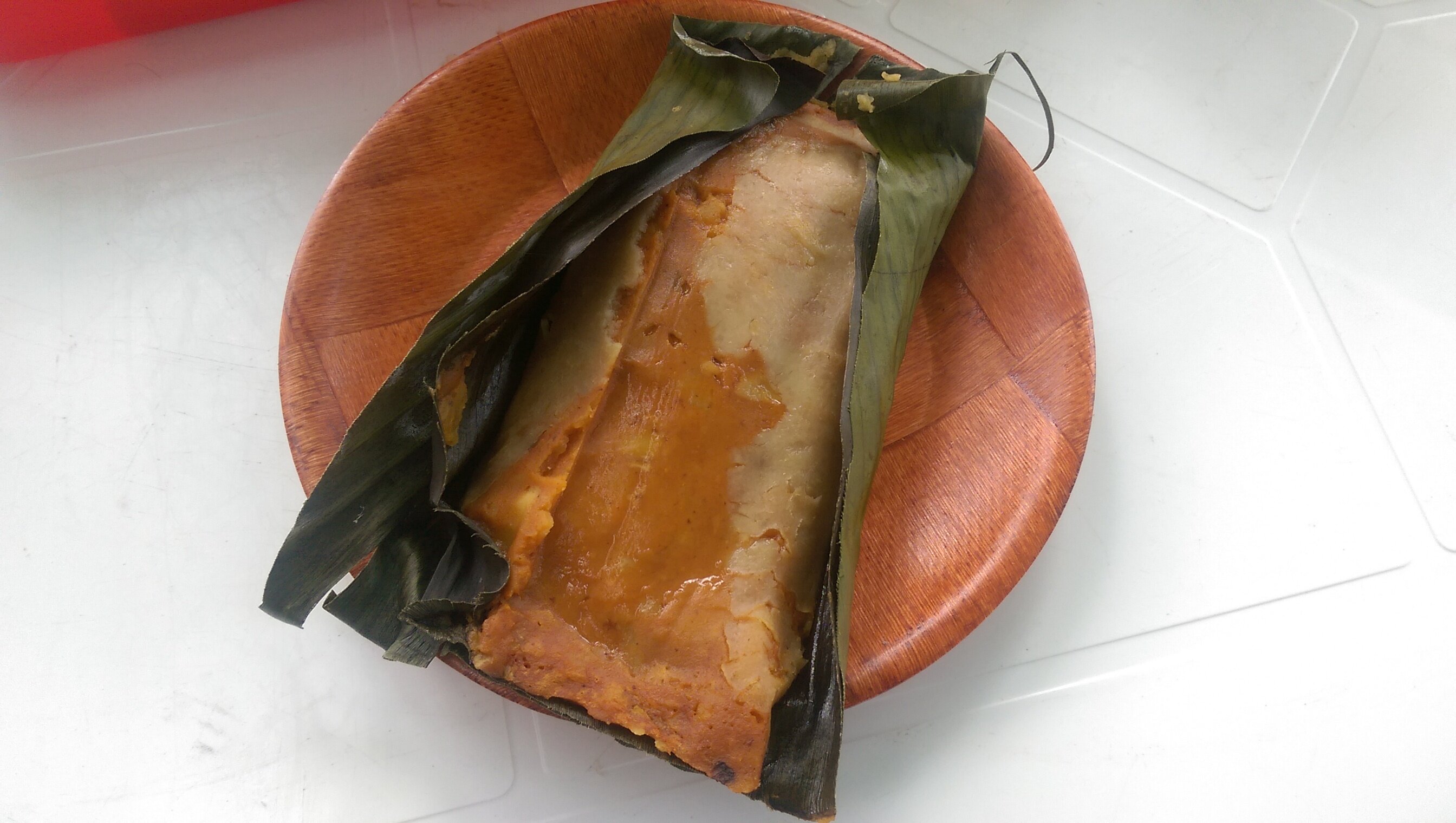Tamales — это обед, завернутый в банановые листья, в полуфабрикатном виде уже готовый, в кафе только разогревают на водяной бане. Состоит из риса, картошки, пол-яйца, кусочек курицы и кусочек свиного сала. Бывают тамалесы вегетарианские, там к рису еще кукурузная каша. Стоит 1$