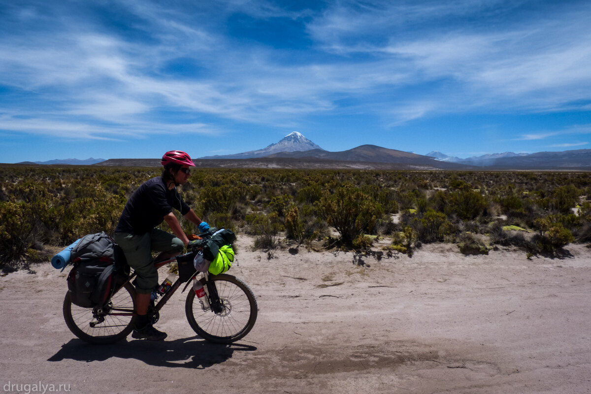 Sajama — небольшой поселок, отсюда можно взобраться на вершину вулкана Sajama (6542 м.), самой высокой горы Боливии. Много хостелов, и цены в магазине сильно завышены. Также вокруг много маршрутов для треккинга, но я не вижу смысла ходить пешком по пустыне, где можно и на велосипеде проехать. Места тут классные, я никак не могу налюбоваться на эту часть Боливии. Ну просто одно из самых приятных мест, где я ездила на велосипеде.