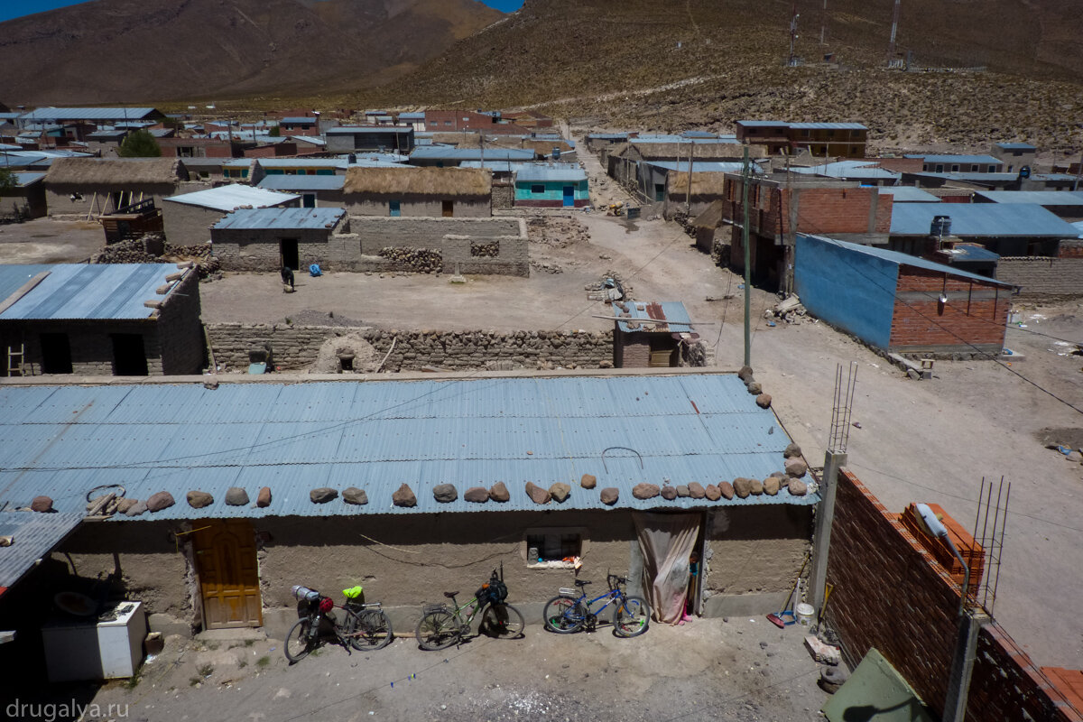После перевала сначала крутой спуск, а потом мы выезжаем в огромную плоскую долину с дорогой-гребенкой и почти без сброса высоты доезжаем до деревень -призраков Santa Flor de Parajalla — все заброшено. Единственный живой человек — пастух-боливиец, живущий в хижине в километре от дороги. Говорит, все разъехались по городам, оставили деревни. Там такая глушь кругом — особенно это заметно на велосипеде, когда передвигаешься очень медленно и до деревни нужно день ехать. На машине все-таки быстрее и поэтому не так уж и далеко кажется.
