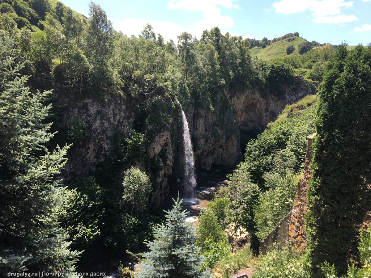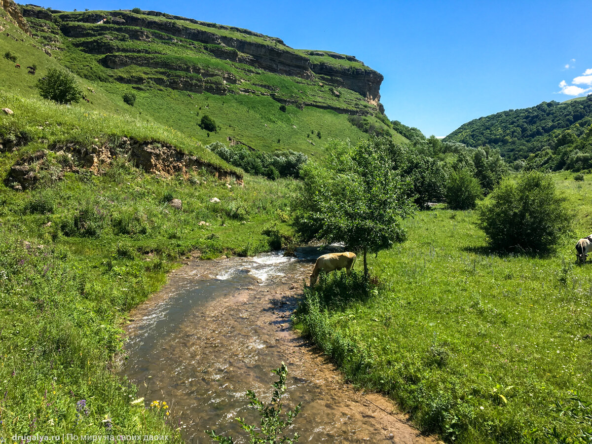 До села Аликоновка едем какими-то закоулками, мостиками и тропами, что видно на треке. После села — первый нарзанный источник. Кисловодский нарзан. Мне — вкусно, а ребята впервые пробуют на вкус газированный железистый напиток. Ничего, привыкнут. Нарзанных источников еще будет много впереди.
