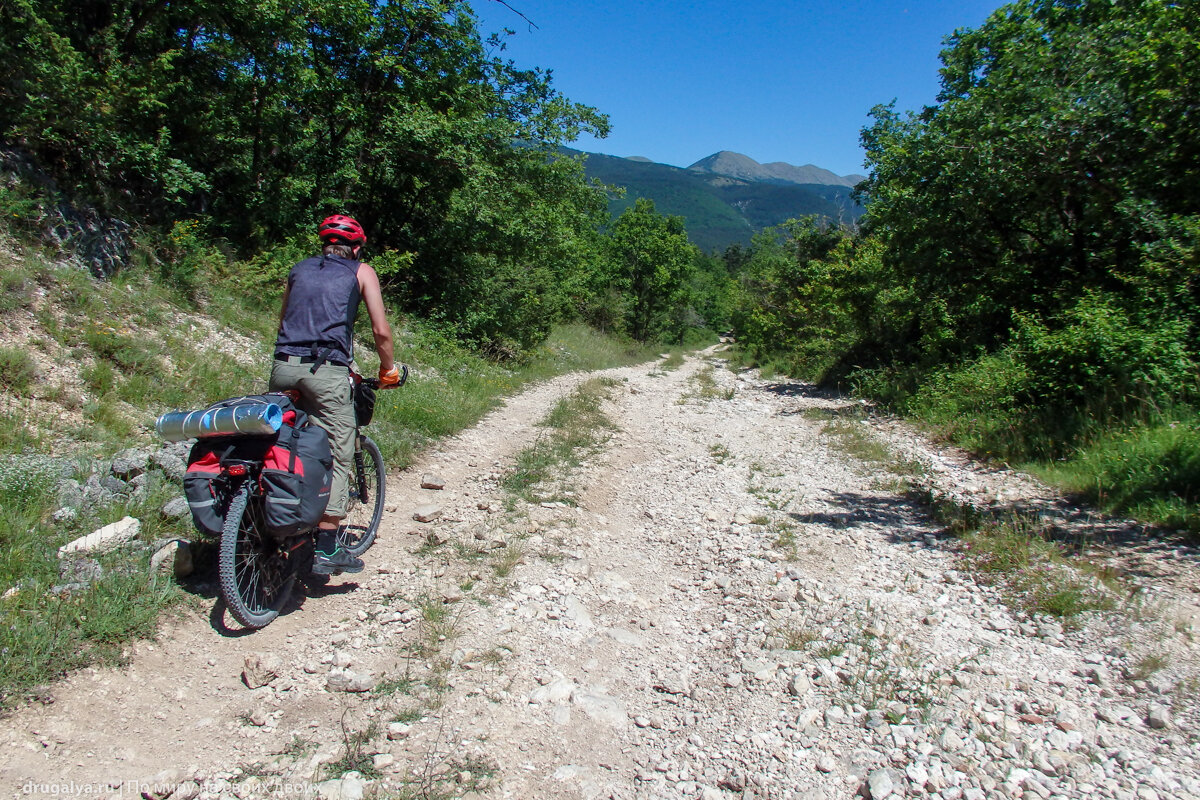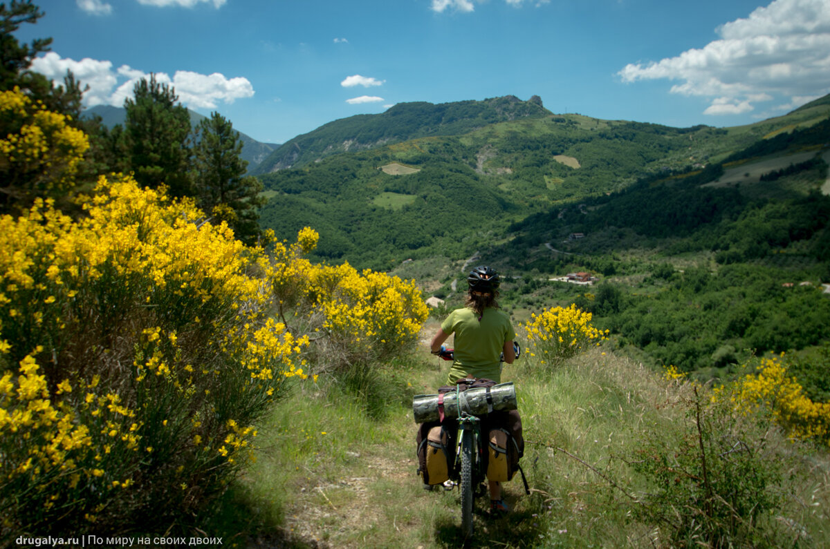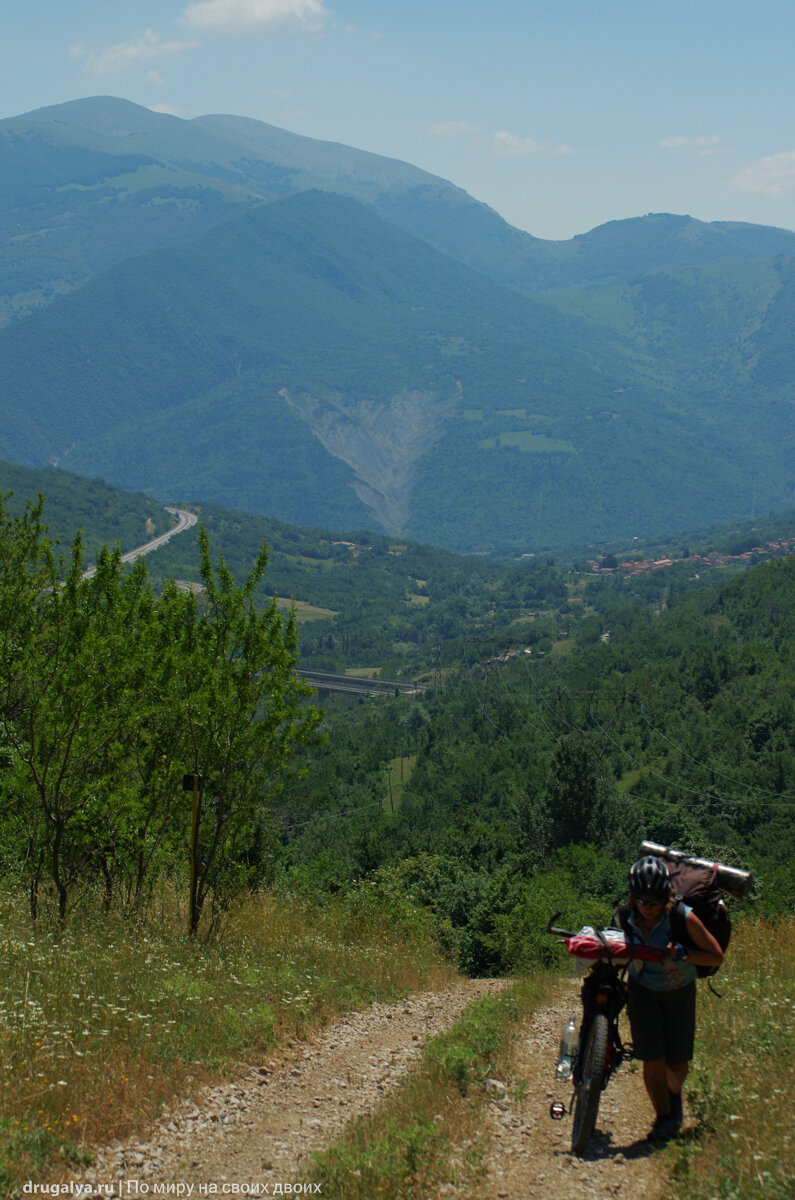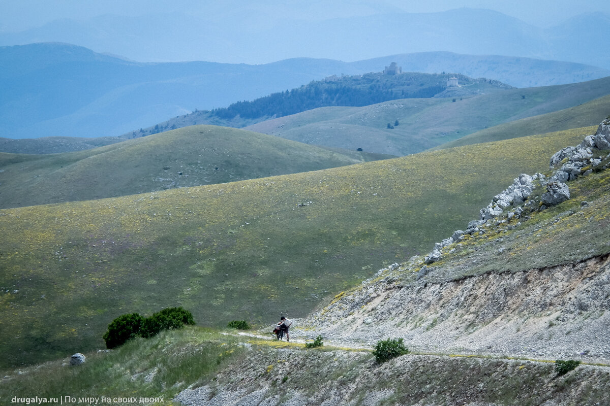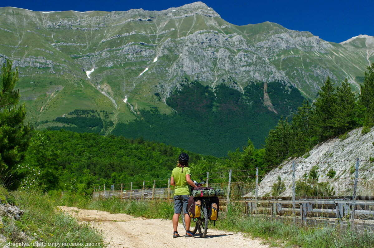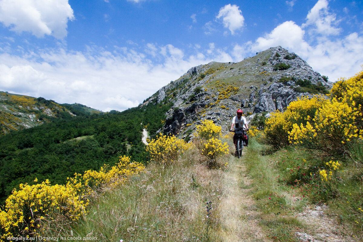 Утром я пешком поднялась на гору с крепостью и необычной формы церковью (Сastelli di Кoca Сalascio). Андрей остался внизу перед серпантином на крепость. Очень красивое место, жаль, что мы вчера поленились подняться немного по грунтовке, там отличные видовые места под стоянку, прямо наверху у церкви. Потом поехали по дороге по направлению к городку Castel del Monte, но свернули на грунтовку и проехали крюк. Грунт опять паршивого качества. В горку ехать фактически невозможно. Но виды потрясающие, не ожидала такого. Напоминает Тянь-Шань с его широченными долинами и цветущими альпийскими лугами. Дикая местность, когда-то очень давно использовалось под сельское хозяйство или под выгон скота. Сейчас же — раздолье для велосипедистов и пешеходников. Кстати, ехали мы по маркированному пешему маршруту.
