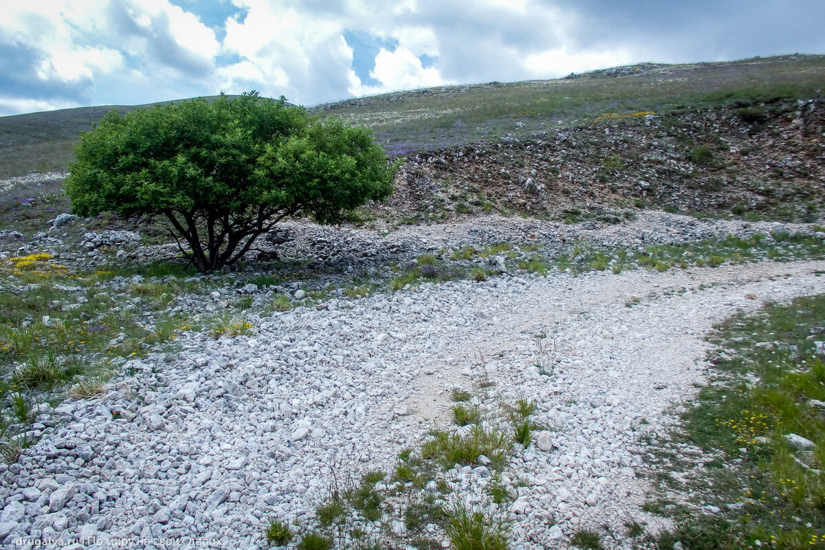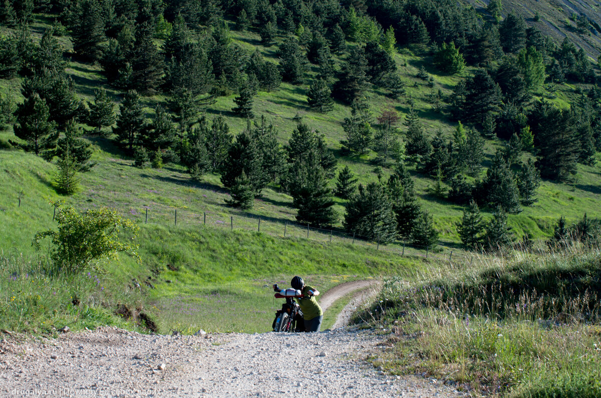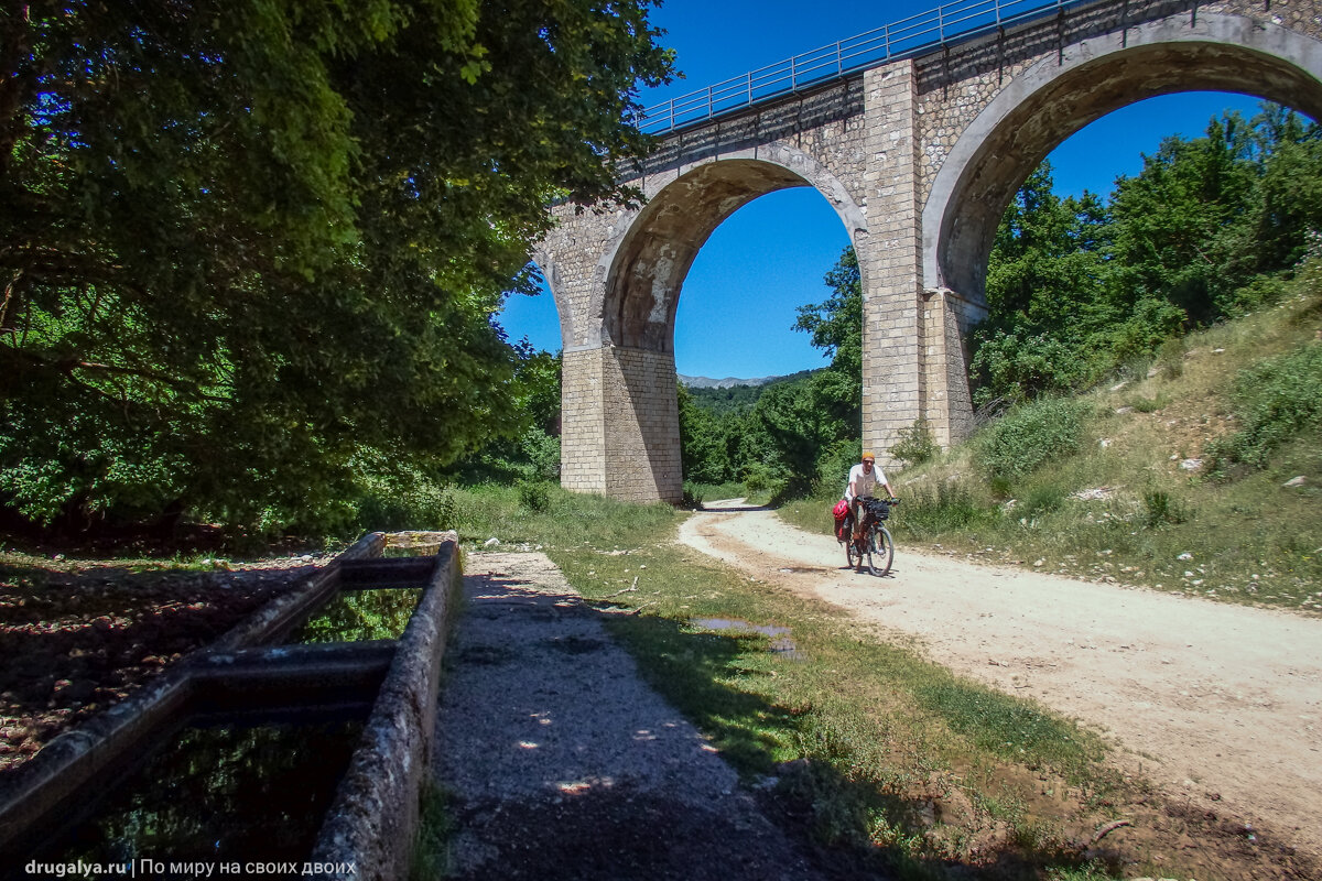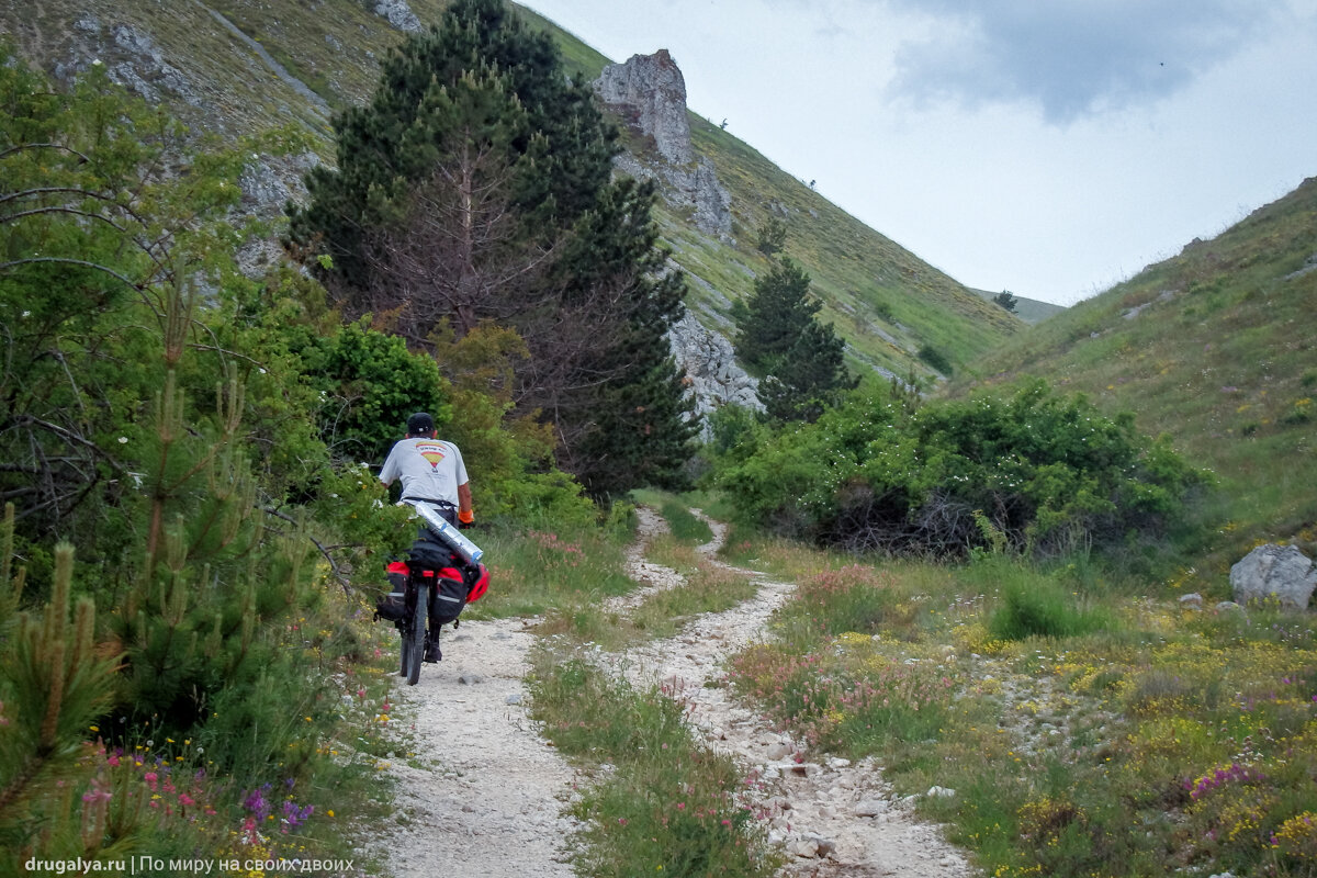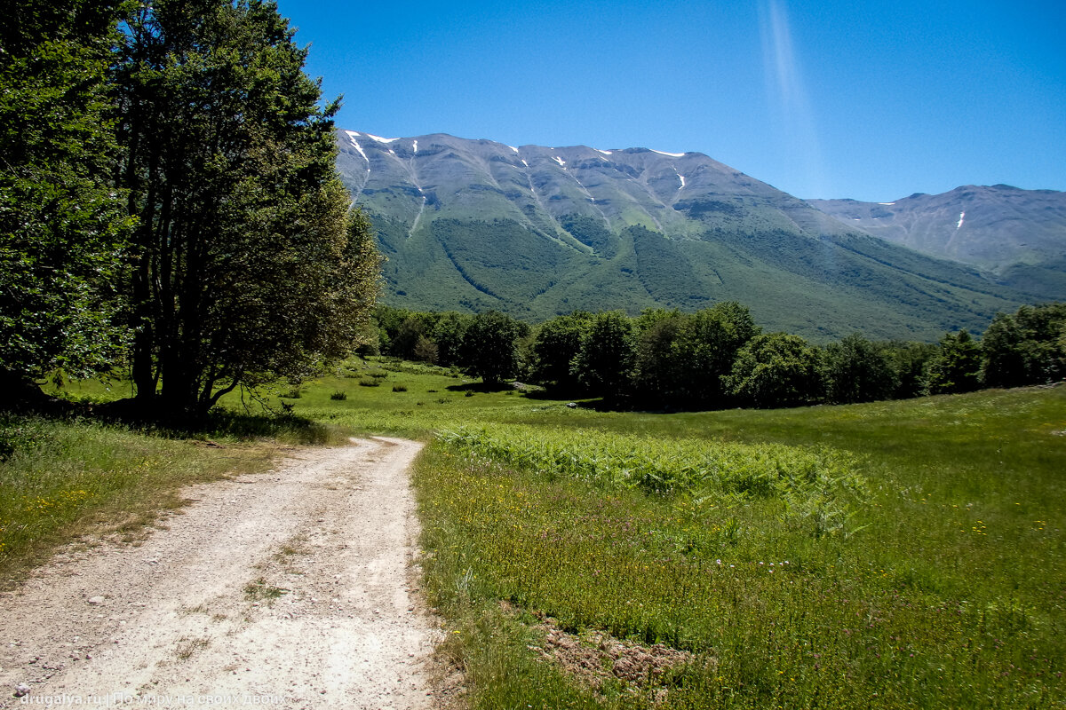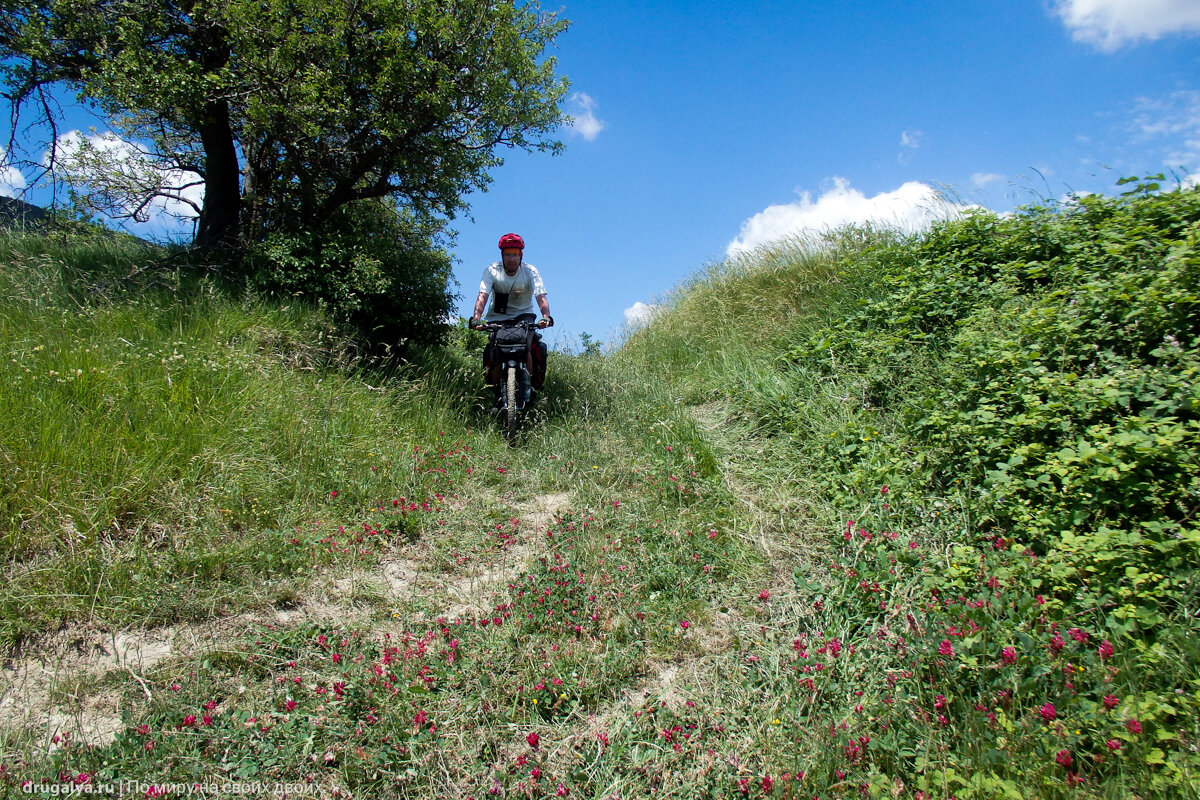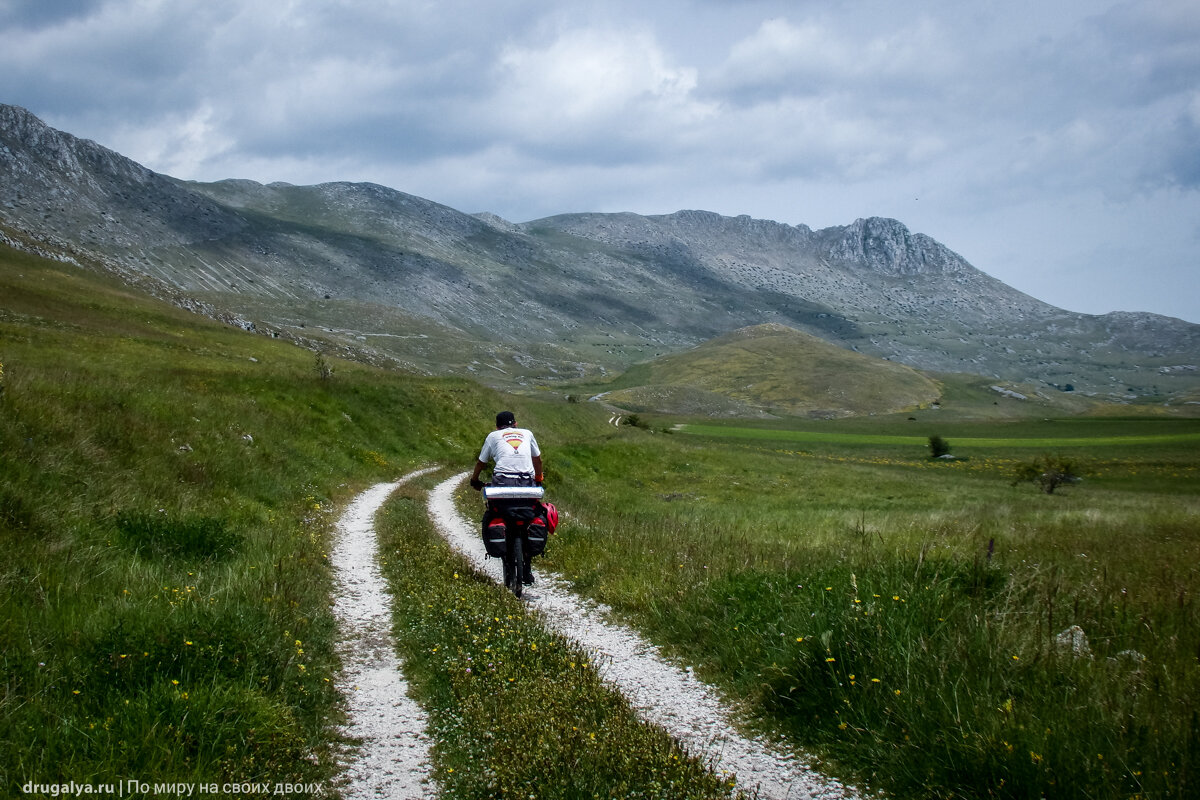 Утром я пешком поднялась на гору с крепостью и необычной формы церковью (Сastelli di Кoca Сalascio). Андрей остался внизу перед серпантином на крепость. Очень красивое место, жаль, что мы вчера поленились подняться немного по грунтовке, там отличные видовые места под стоянку, прямо наверху у церкви. Потом поехали по дороге по направлению к городку Castel del Monte, но свернули на грунтовку и проехали крюк. Грунт опять паршивого качества. В горку ехать фактически невозможно. Но виды потрясающие, не ожидала такого. Напоминает Тянь-Шань с его широченными долинами и цветущими альпийскими лугами. Дикая местность, когда-то очень давно использовалось под сельское хозяйство или под выгон скота. Сейчас же — раздолье для велосипедистов и пешеходников. Кстати, ехали мы по маркированному пешему маршруту.