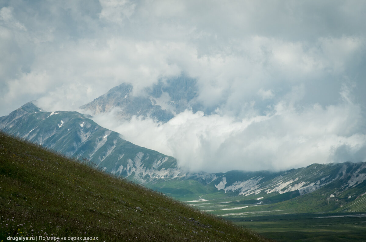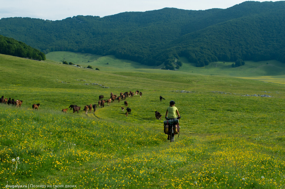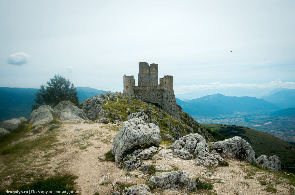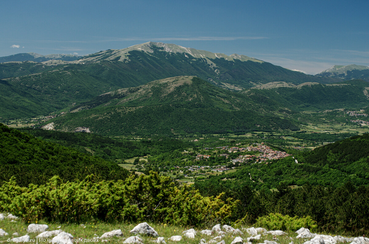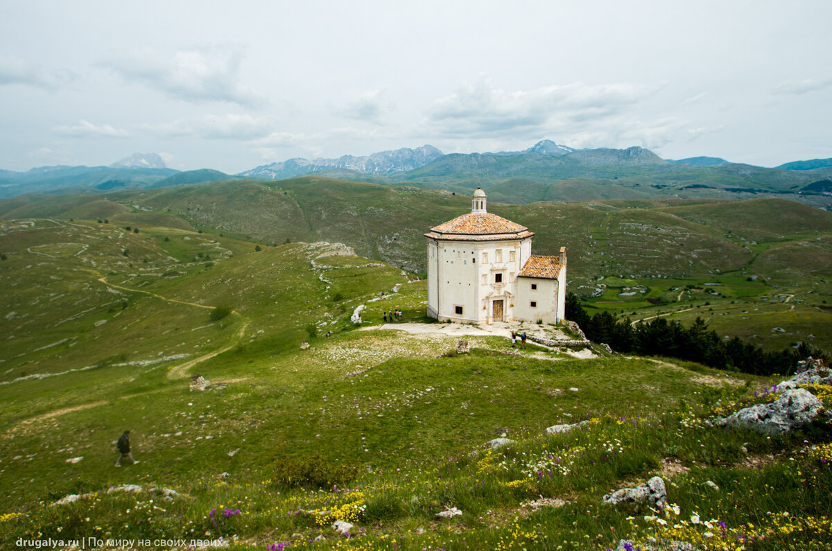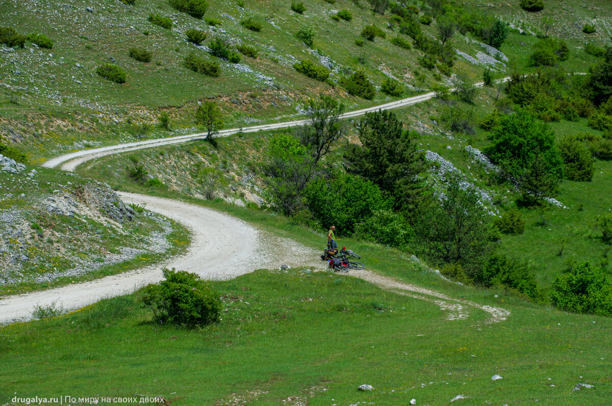 Утром я пешком поднялась на гору с крепостью и необычной формы церковью (Сastelli di Кoca Сalascio). Андрей остался внизу перед серпантином на крепость. Очень красивое место, жаль, что мы вчера поленились подняться немного по грунтовке, там отличные видовые места под стоянку, прямо наверху у церкви. Потом поехали по дороге по направлению к городку Castel del Monte, но свернули на грунтовку и проехали крюк. Грунт опять паршивого качества. В горку ехать фактически невозможно. Но виды потрясающие, не ожидала такого. Напоминает Тянь-Шань с его широченными долинами и цветущими альпийскими лугами. Дикая местность, когда-то очень давно использовалось под сельское хозяйство или под выгон скота. Сейчас же — раздолье для велосипедистов и пешеходников. Кстати, ехали мы по маркированному пешему маршруту.