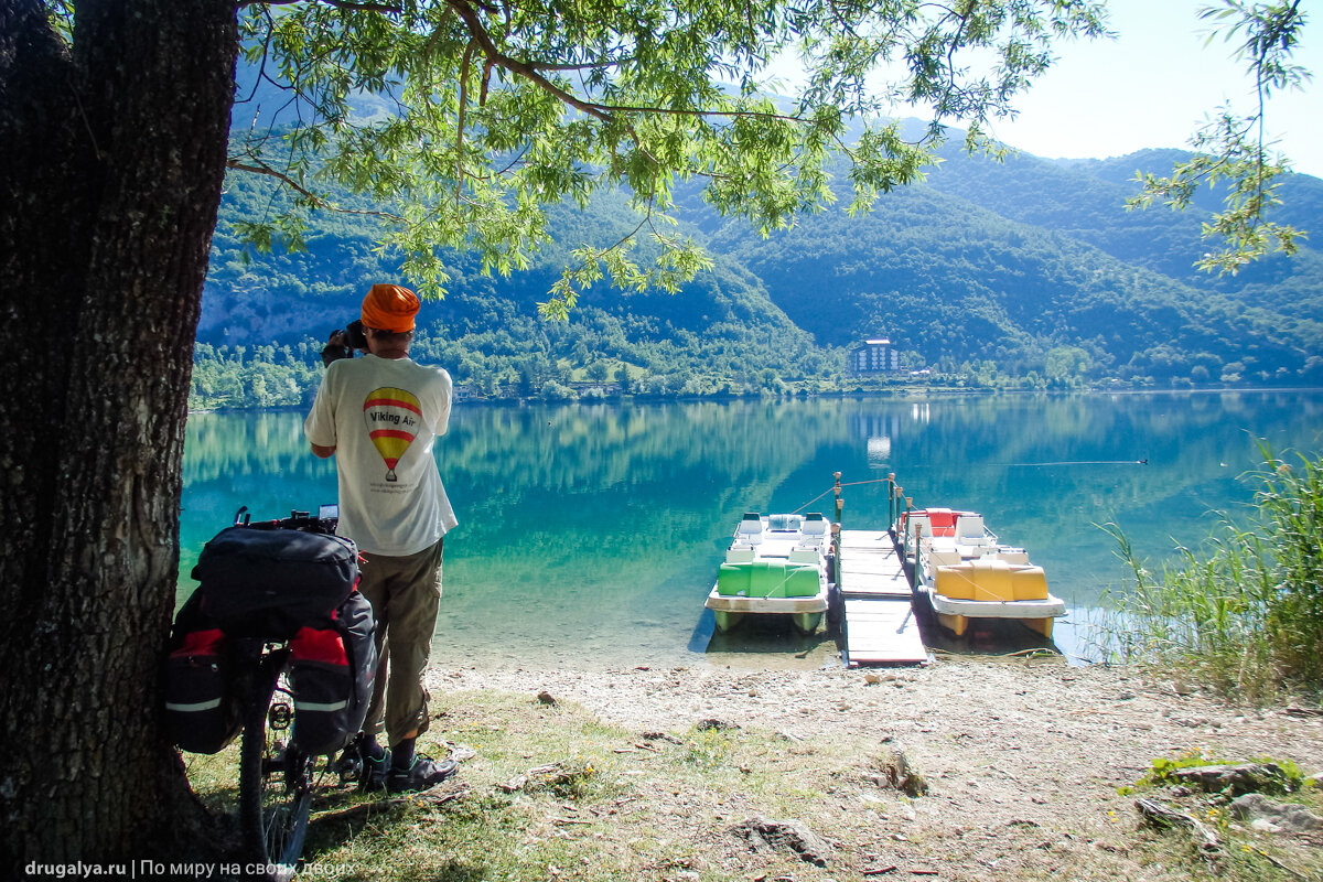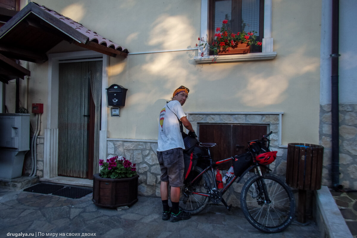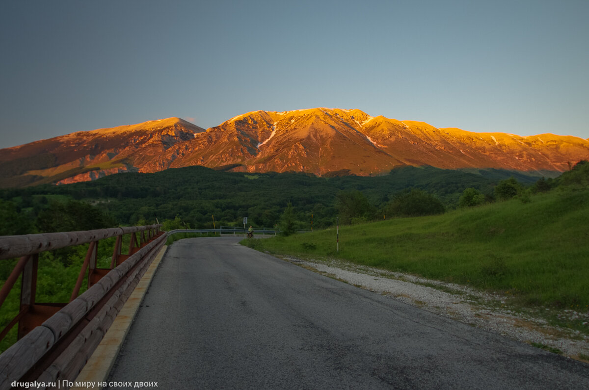 Выехали в 2:30, на перевале были в 9 вечера. Днем ехать очень тяжело, жарко, в горку — смерти подобно. Не знаю как мы справились. Была надежда купить еды в городке Caramanico Terme, но все закрыто, так что съели по мороженному. Вернулись немного назад, к ларьку с сыром и колбасой. Купили немного вкусного запеченного мяса, сыра, 3 черствых булки panini, кофе, колу — 16€. Но зато на ужин хоть есть что-то. Потом в другом городке купили макарон местного разлива, очень вкусные кстати. Приободренные наличием еды потихоньку докатили до перевала, я уже из последних сил. Но там чуть ниже классное место, мангалы, родник, место для пикников, очень чисто, и лес красивый, похоже на место у испанского колодца у нас на караби. Стоило ехать сюда. Утром постирались, помылись.