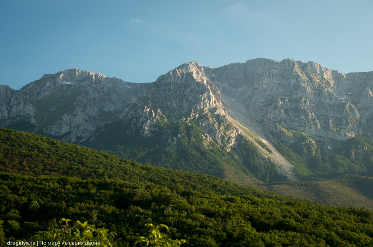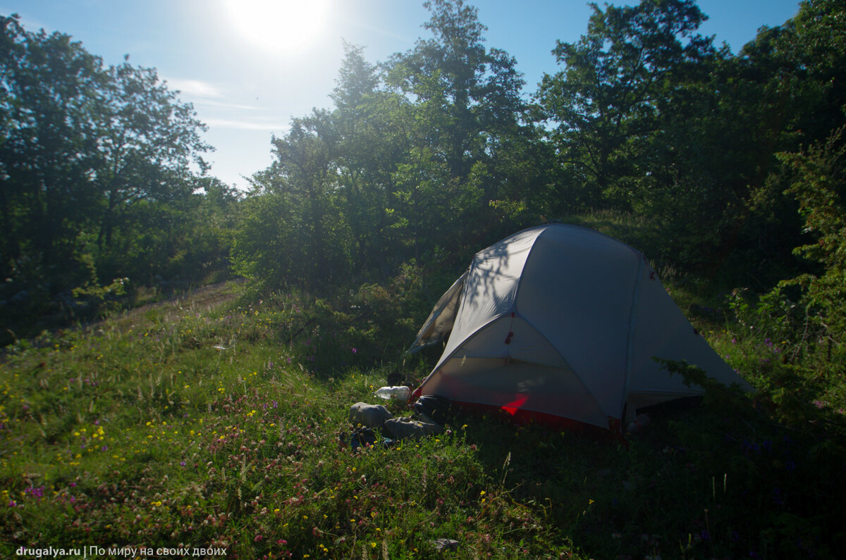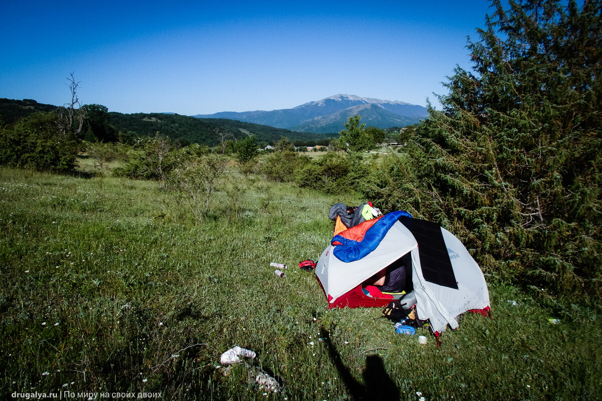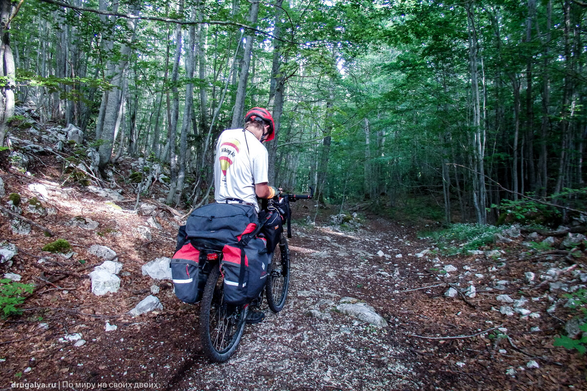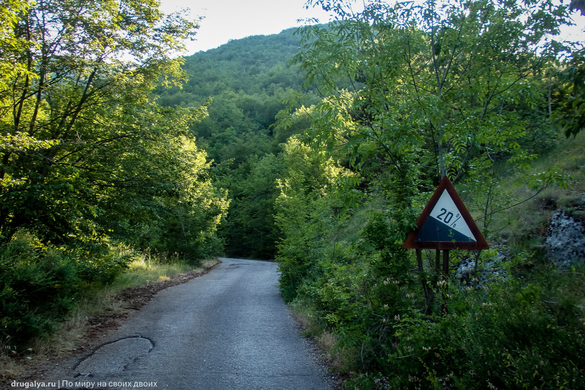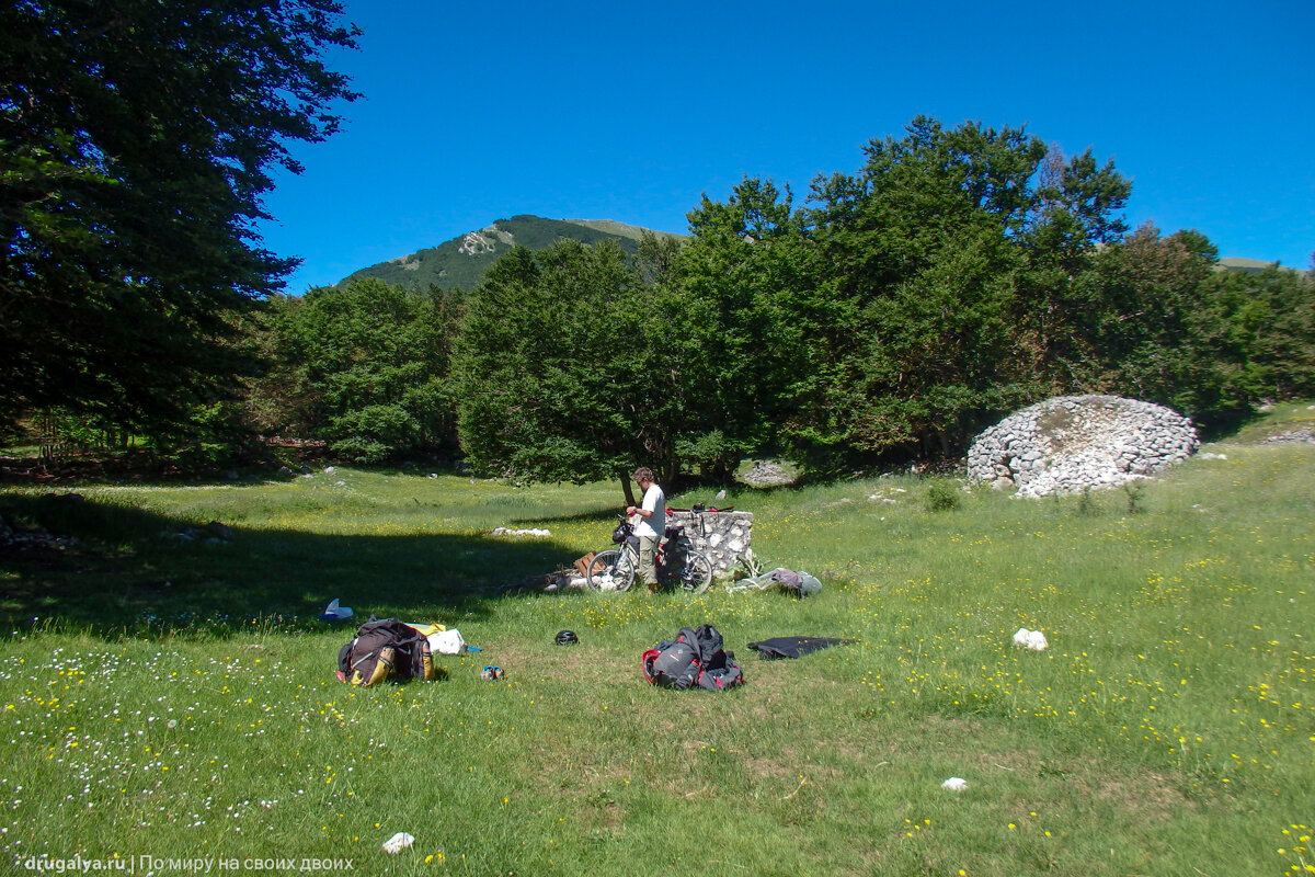 Наконец выехали на асфальт – на огромное плато Sasso Grande – как 500 футбольных полей. Там прикольный ресторанчик – покупаешь мясо на палочках или колбасу/сыр, и сам жаришь на мангалах. Угли, решетки и соль прилагаются. Наели на 11€ . Потом был учаток букового леса с тропой каменистой, с ветками и большими камнями, хорошо что в основном на спуск, вверх было бы очень круто. Из леса выехали на широкое урочище-пастбище, без тропы, только узкая лошадиная тропка в траве. Наконец, выехали на грунтовку, потом на асфальт и все время вниз, вниз. Заночевали на обочине дороги, там был заросший большой карман с плакатами нац. парка и, некогда, видовыми площадками. Сейчас все совсем заросло и никаких видов нет.