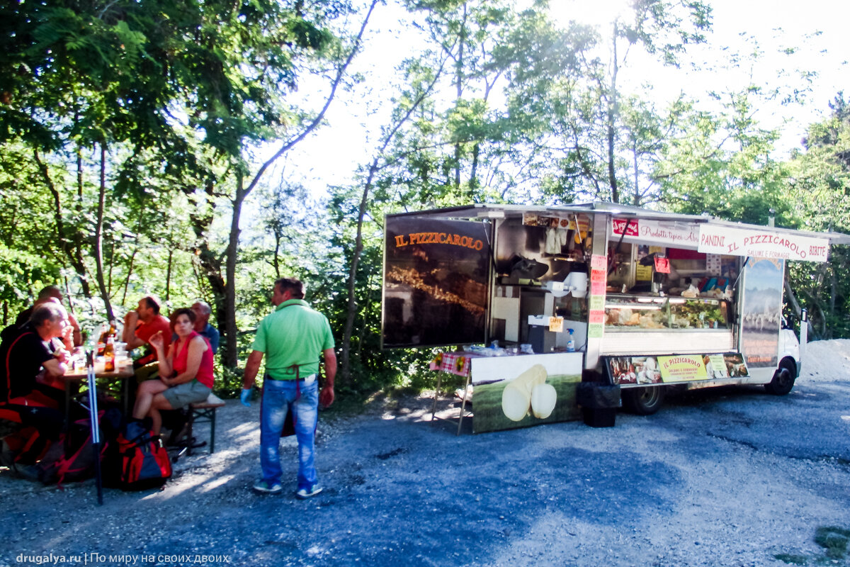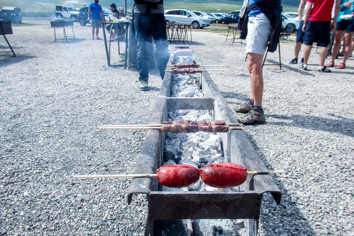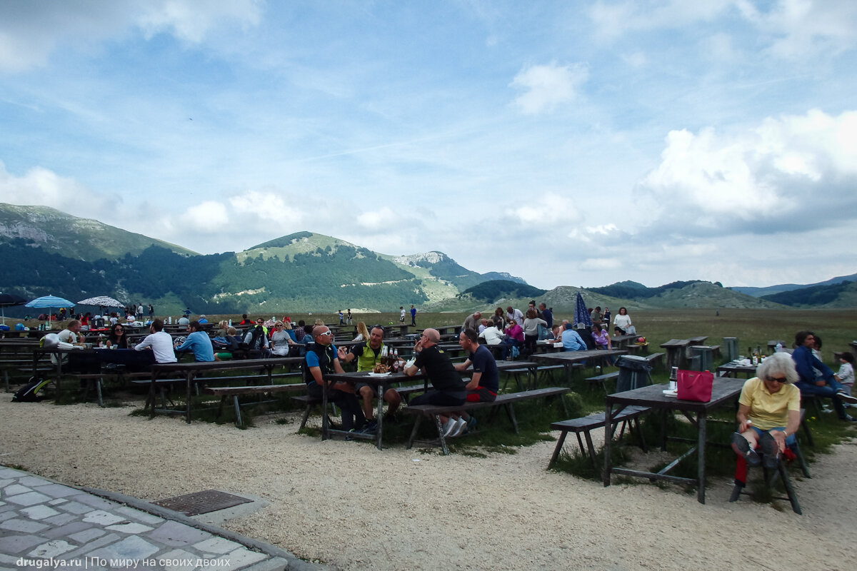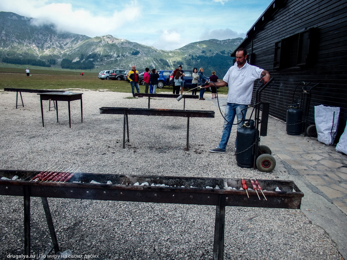 В силу удаленности этого маршрута от городов и больших сел, фактически негде закупить еду. Кроме еды в барах и кафе нет ничего съестного. Хоть мы первоначально и купили продуктов на 3 дня, еще два раза нам пришлось покупать сыр/колбасу/хлеб в ларьке у дороги – чтобы хоть чем-то было поужинать. Это все конечно вкусно, но довольно дорого. За маленький кусочек сыра, 200 грам печеного мяса и 3 булочки можно отдать 14 евро. Но то, что я обязательно рекомендовала бы – это зайти в придорожный ресторан на плато Grand Sasso «Ristorio Mucciante». Это мясной ресторан с огромным количеством столов на улице, и находится он в огромном поле размером со 100 футбольных полей. Сам ресторан – это ресторан самообслуживания и «самоготовки»: на кассе покупаешь сосиски, сырое мясо на шампурах, хлеб и сыр, все это взвешивают, выдают пластиковые тарелки, а на улице стоят десятки мангалов с углями, решетки-гриль, соль – и сам себе жаришь шашлык или бутерброд на гриле, очень удобно получается. Всем весело, все заняты делом, и стоит это дешевле, чем в ресторане.